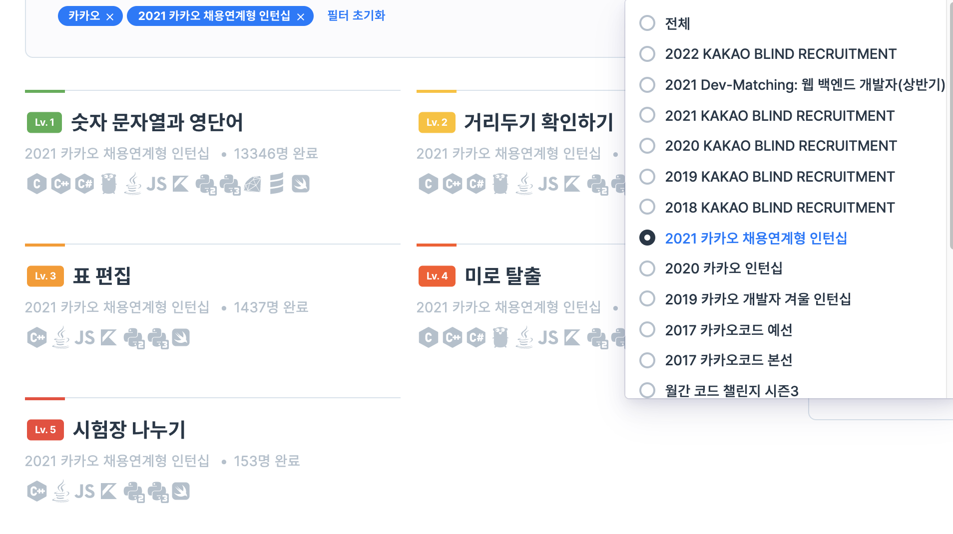 현재는 2021 카카오 채용연계형 인턴십 코딩 테스트 문제도 공개되어 있다.