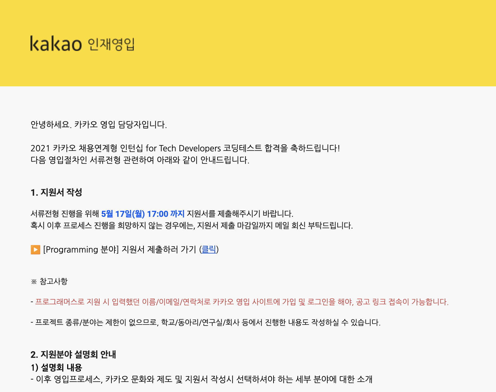 코딩테스트 후기는 여기에서 [취업/후기] - [카카오] 2021 카카오 Tech developers 채용연계형 인턴 코딩테스트 후기 [카카오] 2021 카카오 Tech developers 채용연계형 인턴 코딩테스트 후기 인턴십은 작년
