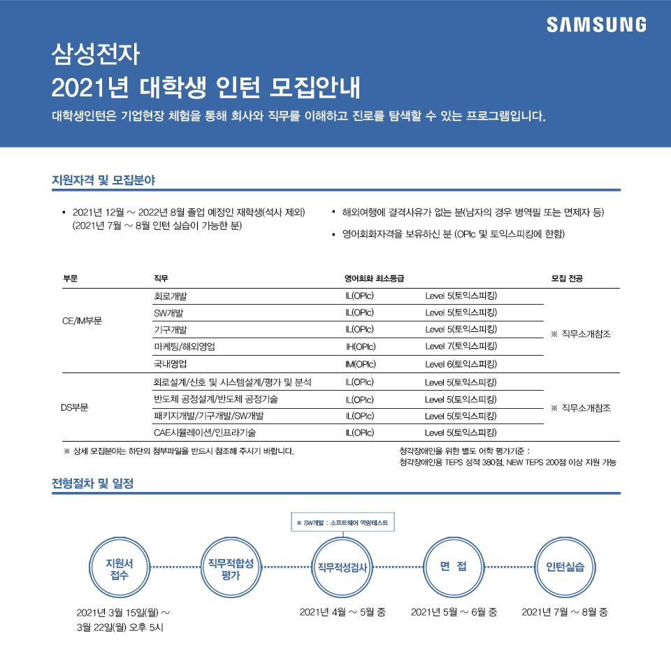 3월 15일에 삼성전자 2021년 대학생 인턴 모집 공고가 떴습니다.