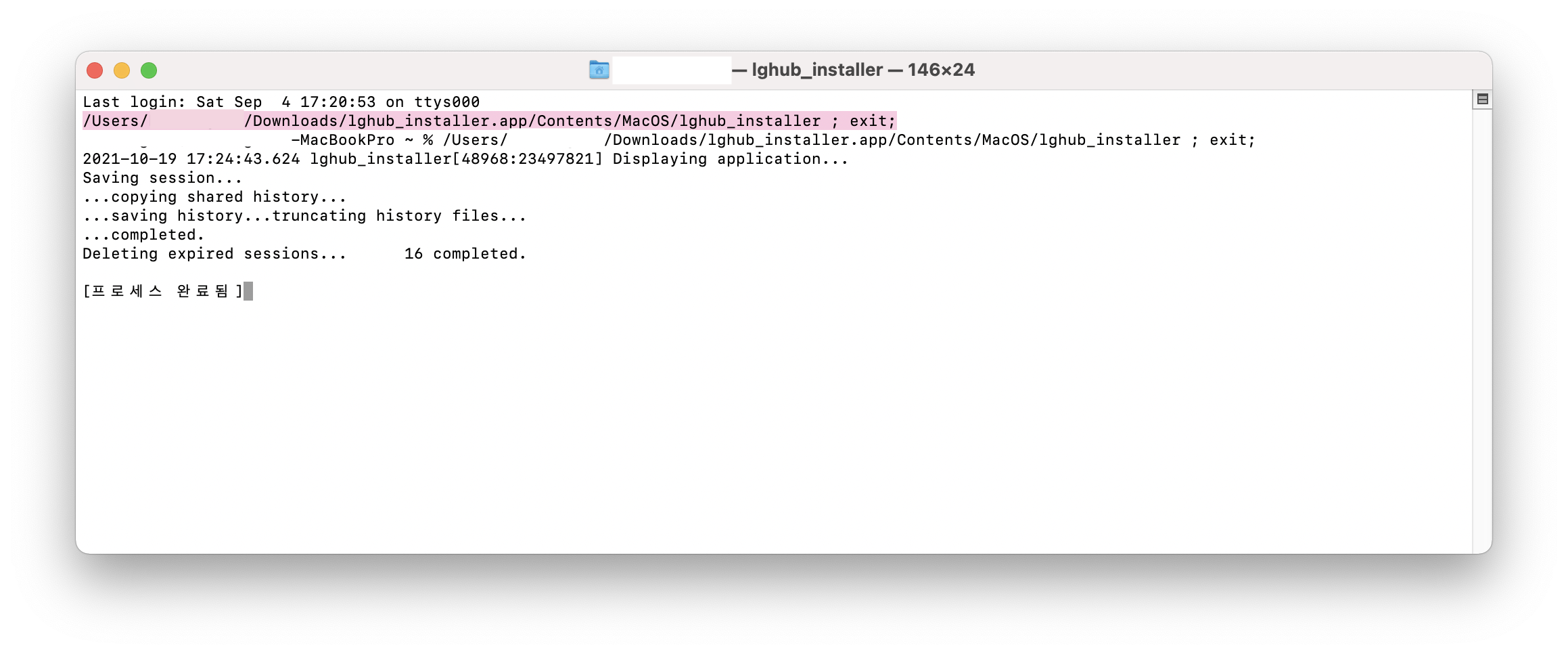 sudo /Users/사용자/Downloads/lghub_installer.app/Contents/MacOS/lghub_installer ; exit;